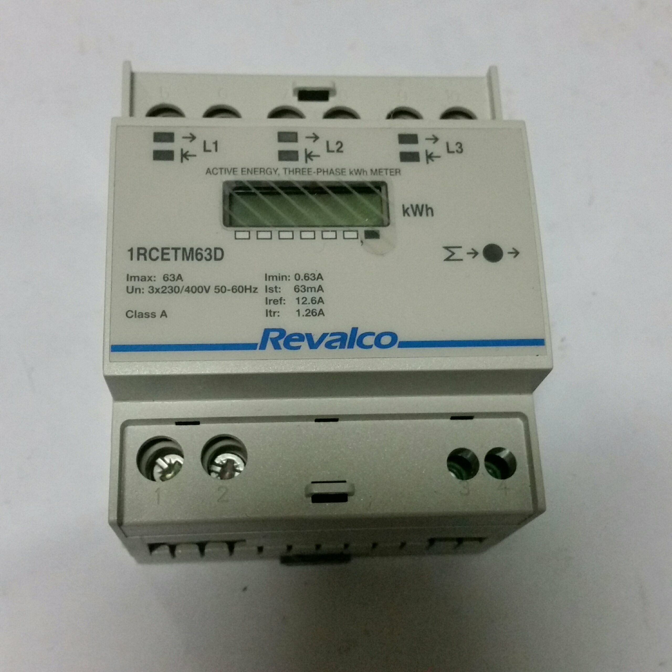 REVALCO 1RCETM63D Contatore di potenza 3P+N, misuratore di consumo per barra din, 230V, 3 poli + neutro, corrente nominale 15kw (63)A, display LCD, 6 interi+1 decimale, 4 moduli inserzione diretta